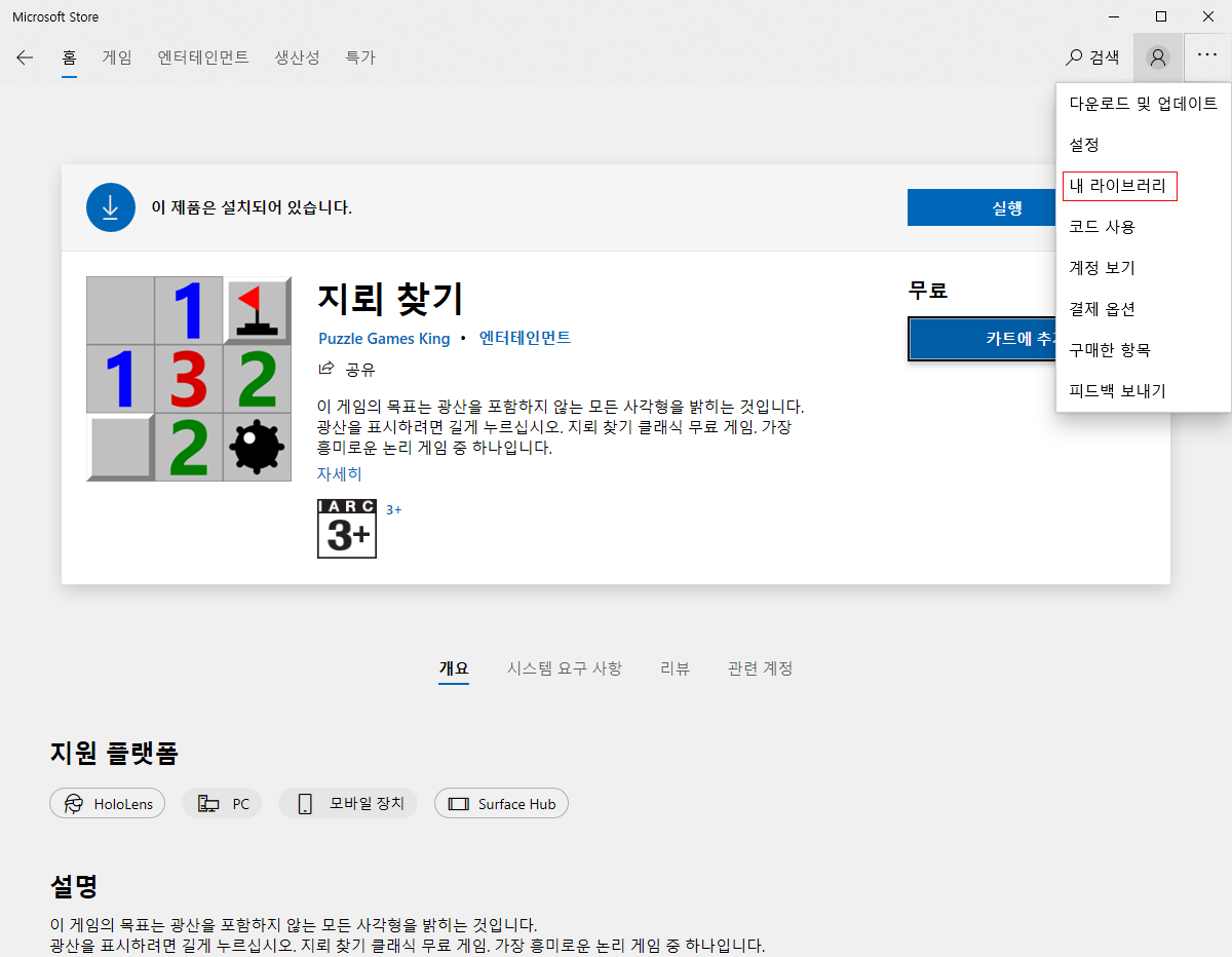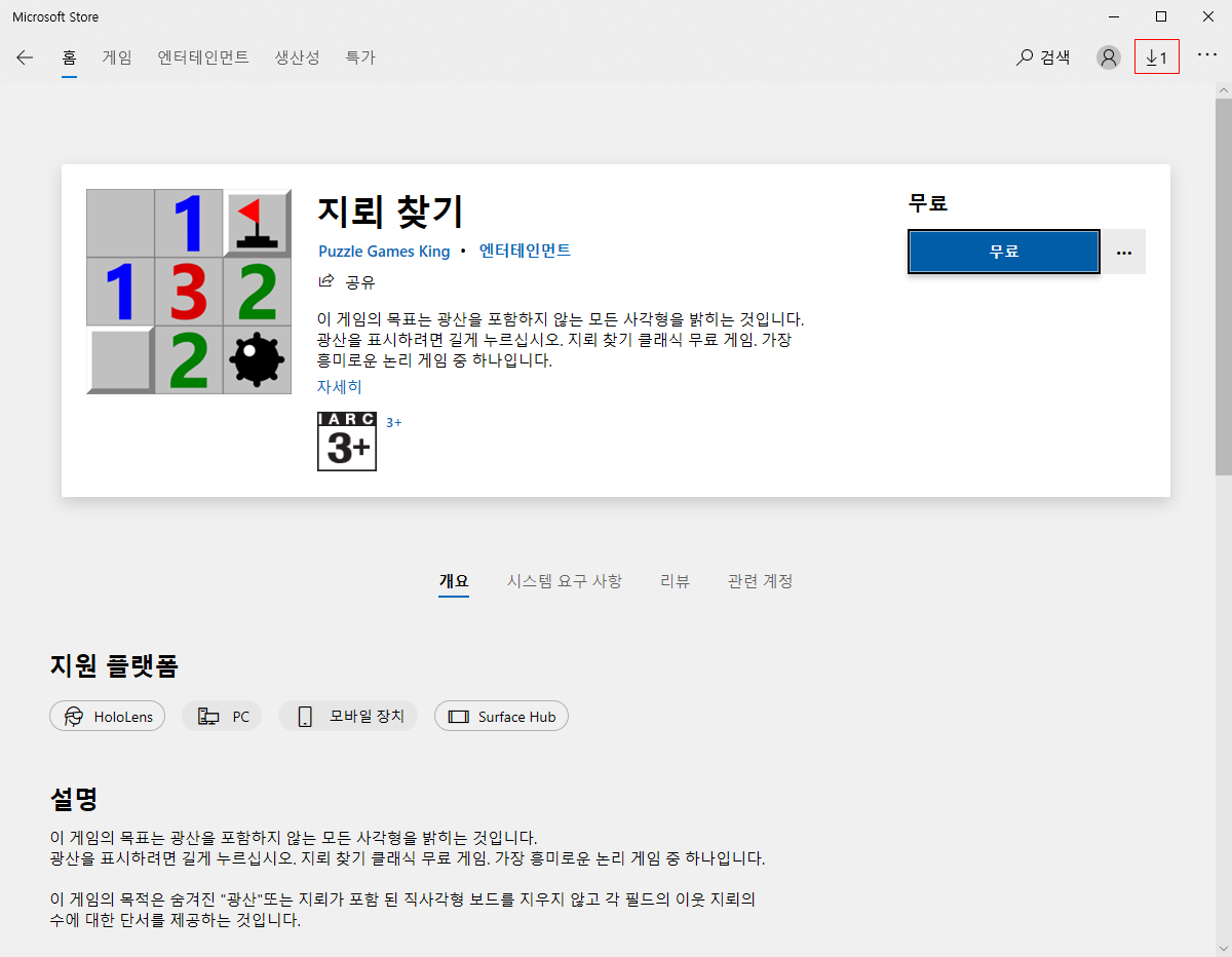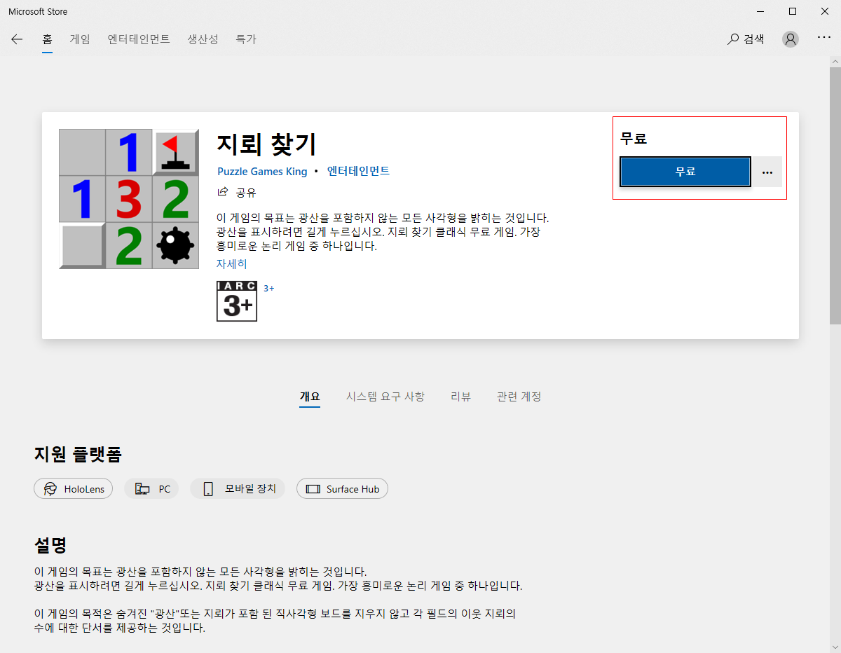 지뢰 찾기라는 게임은 이전에서도 무료로 제공해서 그런지, 동일하게 무료로 다운받으실 수 있습니다.