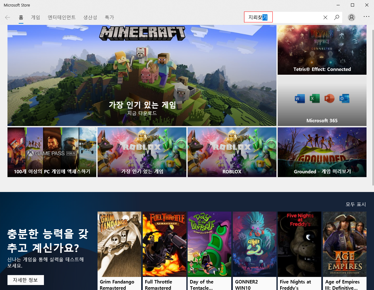 우측 상단에 위치하는 "검색" 버튼을 눌러 설치 하고자하는 게임을 검색합니다. ex) 지뢰찾기