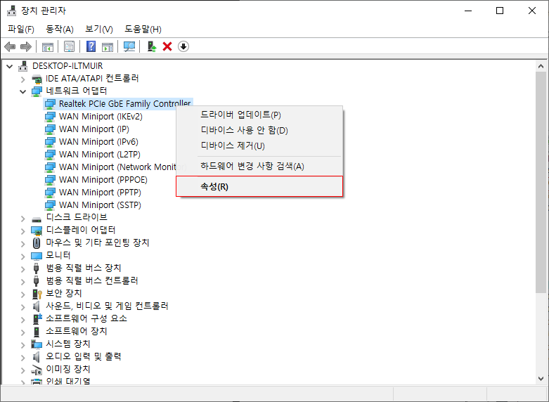 네트워크 어댑터 하위의 Realtek PCIe 의 설정입니다. 우클릭버튼을 눌러 속성으로이동합니다
