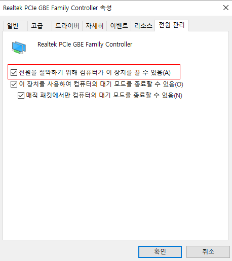 아래의 전원 관리에서의 "전원을 절약하기 위해 컴퓨터가 이 장치를 끌 수 있음" 을 해제합니다.