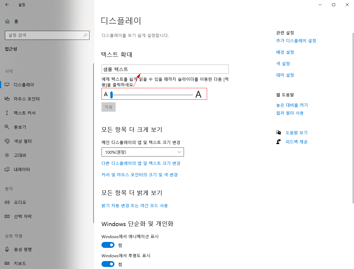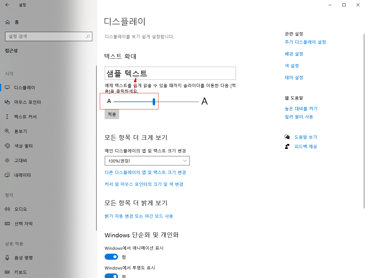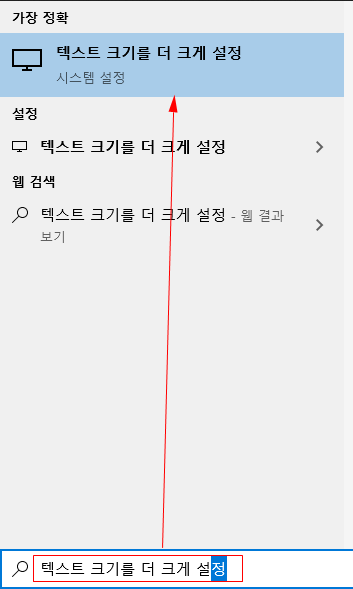윈도우 키를 눌러 "텍스트 크기를 더 크게 설정" 입력