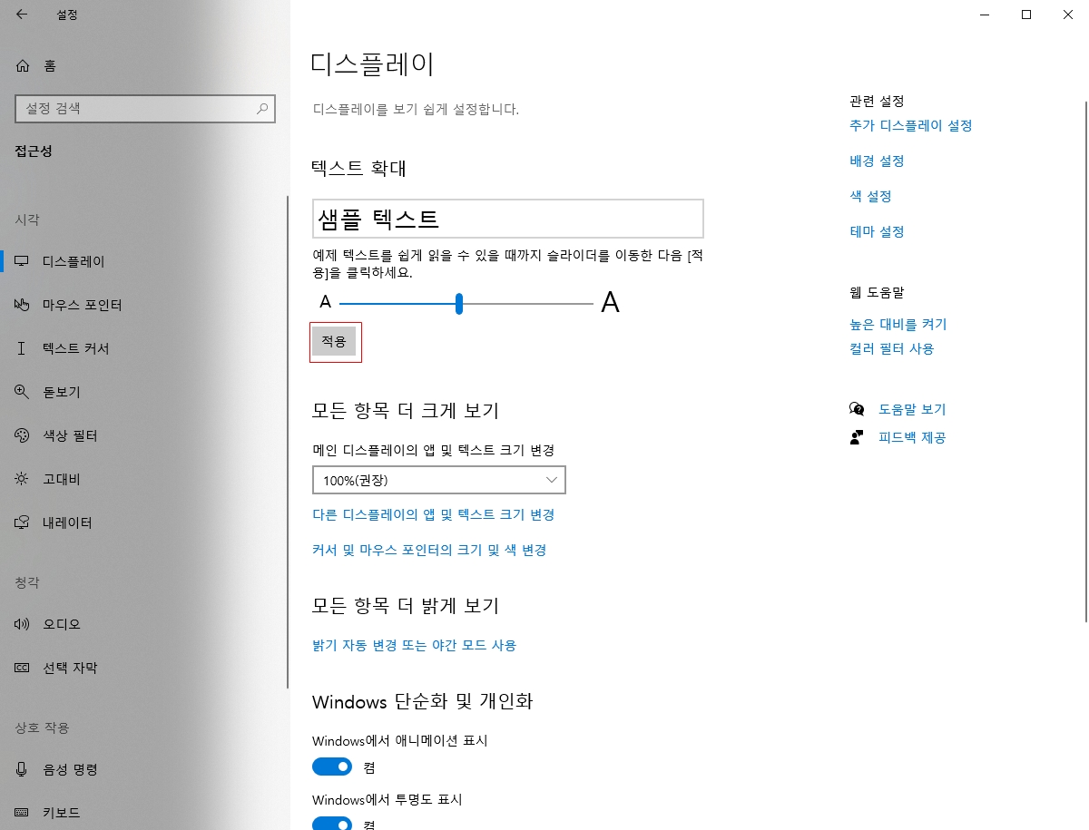 확대된 텍스트를 체크하고 만족스러운 크기에서, 적용버튼을 눌러 적용합니다.