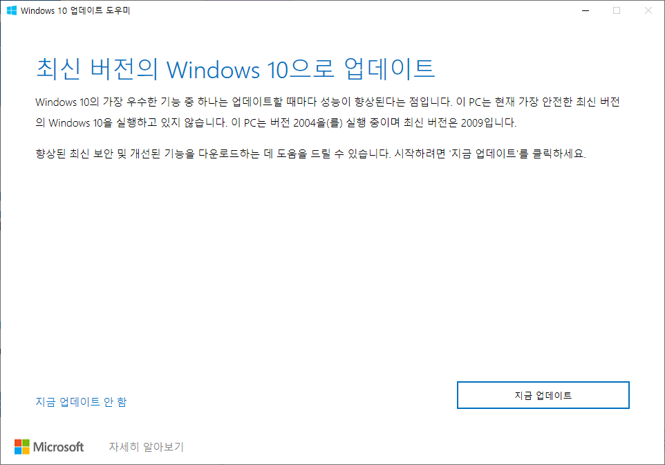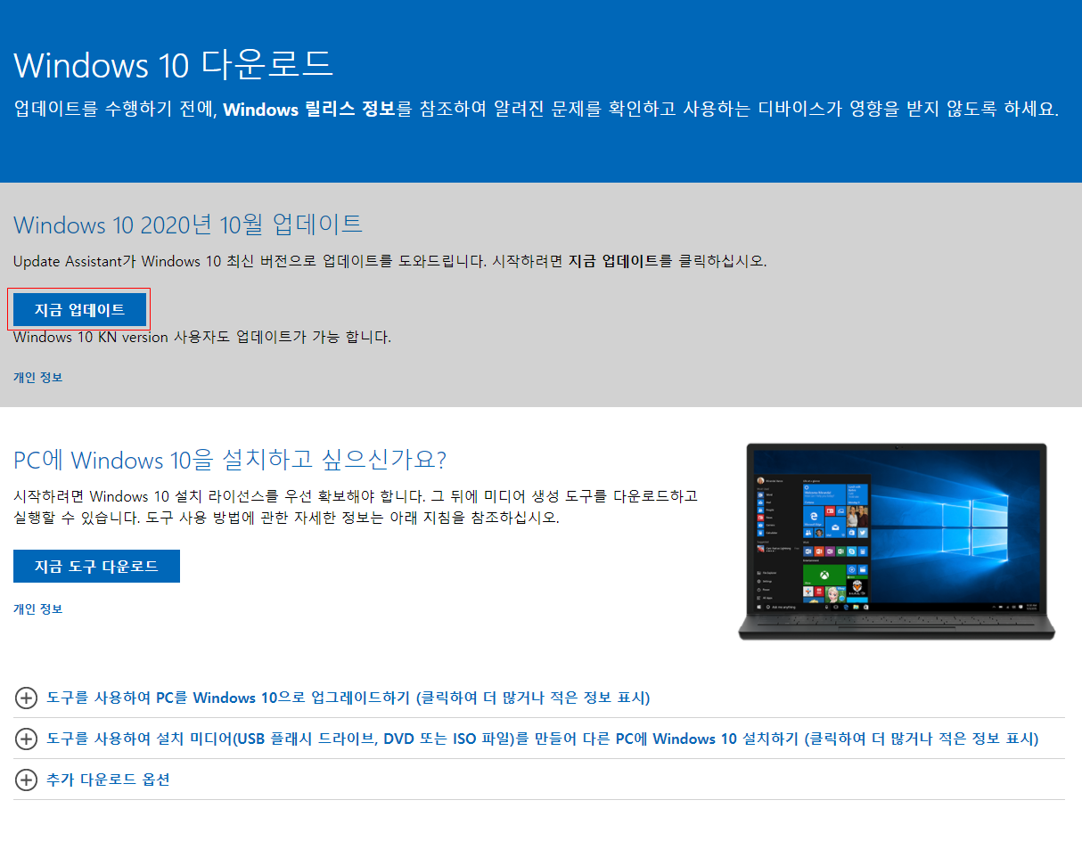 사실상 2016년 07월 31일이 무료 업그레이드 행사가 중단되었지만 윈도우10의 점유율을 높이고자 함인지 아직도 업데이트는 간단하게 처리가 가능하다, 지금업데이트 버튼을 눌러 툴을 다운받아줍니다.
