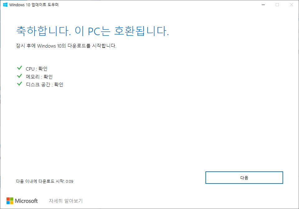 지금 업데이트 버튼을 눌르면 CPU, 메모리, 디스크 공간을 체크하게 되고 업데이트를 할것인지에 대해 한번더 물어보는 창이 확인됩니다
