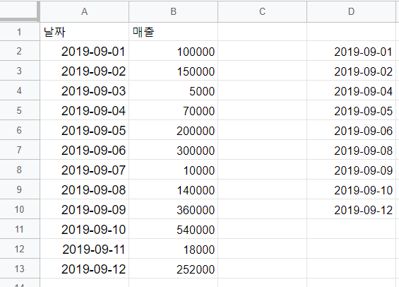 위와같이 입력하였을때, 일자와 매출에서, 일자/매출 조건에 해당하는 데이터를 뽑아봤습니다.