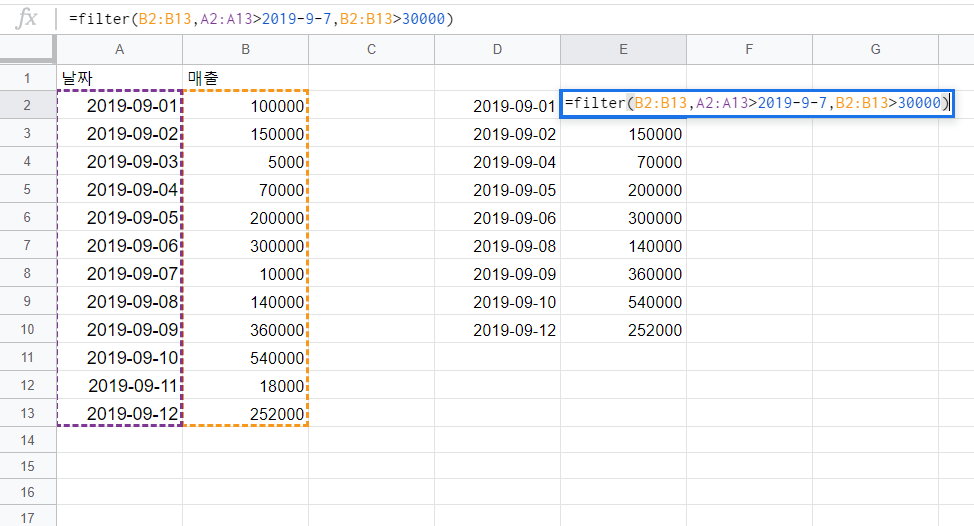 그다음조건으로 B열 (매출) 을 조건에 넣어 금액을 넣었습니다.