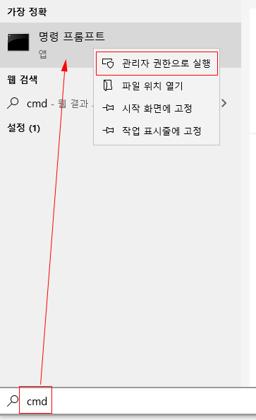 명령 프롬프트는 반드시 관리자 권한으로 실행되어야 합니다