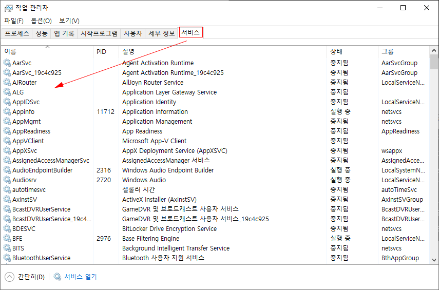 작업 관리자를 띄운 후, 서비스 탭으로 이동합니다