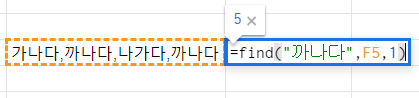 FIND 함수의 대입은 검색하는 문자열, 그다음 검색할 범위/위치 를 선택해준뒤 , 시작위치를 정해줍니다.