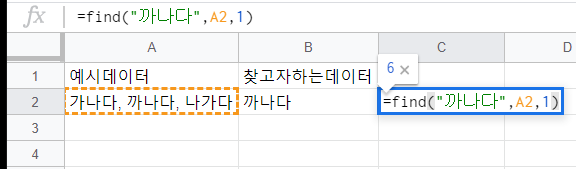 위와같이 =find("까나다",A2,1) 와 같이 입력했습니다. 첫번쨰 까나다라는데이터를 찾는다고 입력하고, 그다음에는 기준데이터인 A2를 선택한 뒤, 몇번째부터 찾을것인지선택합니다, 까나다 라는 데이터는 6번째 부터 위치하고있기때문에, 0~6 사이의 값을 입력하는 경우 적용됩니다.