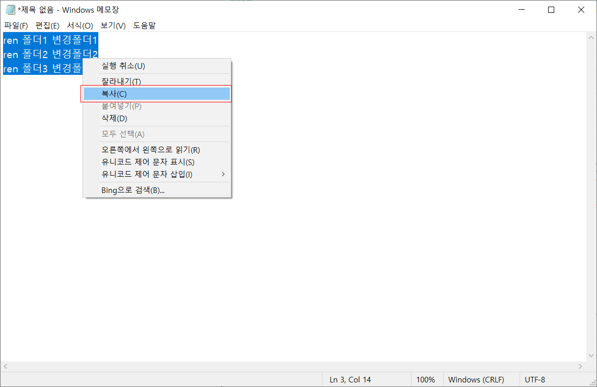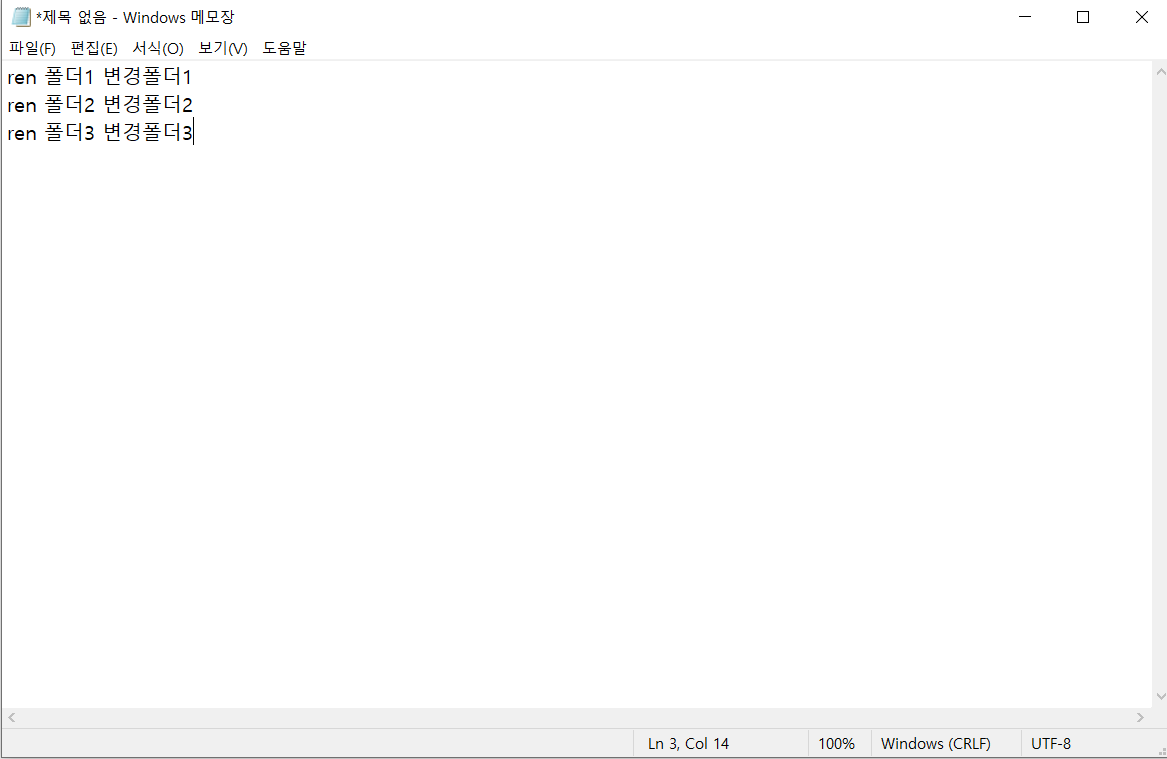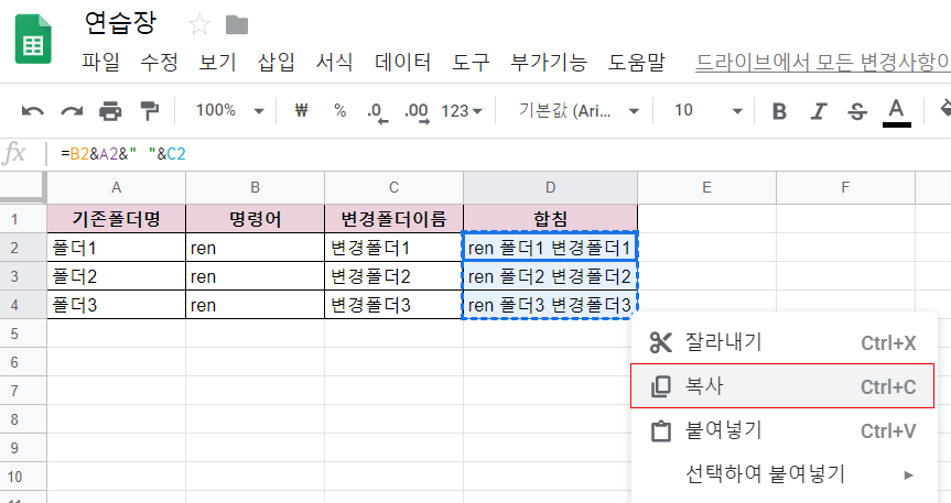 값이 ren 폴더1 변경폴더1 라는 값이 산출되었고,