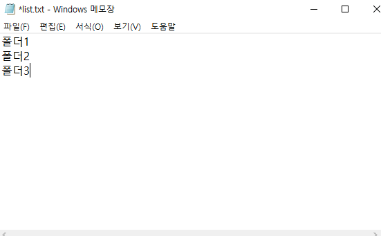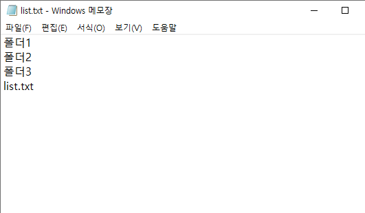 위와같이 명령어를 사용해줍니다. 위의 명령어는 해당폴더 하위의 모든내용들을 list.txt 텍스트파일을 만들어 나열하는 명령어 입니다.
