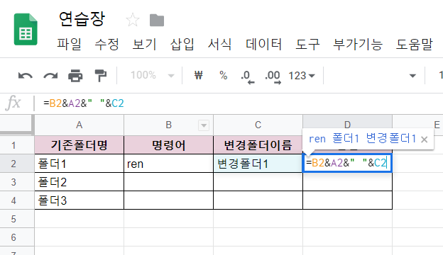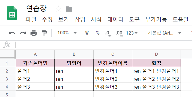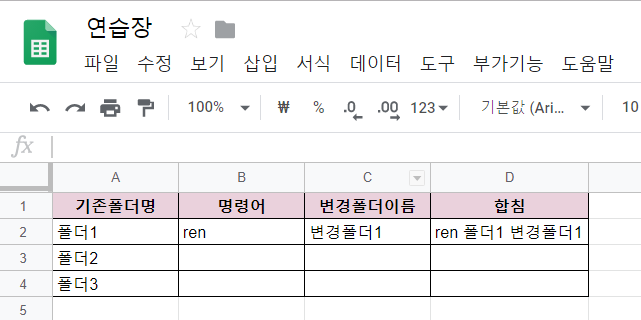 스프레드시트를 열어 명령어를 만들어보도록하겠습니다.