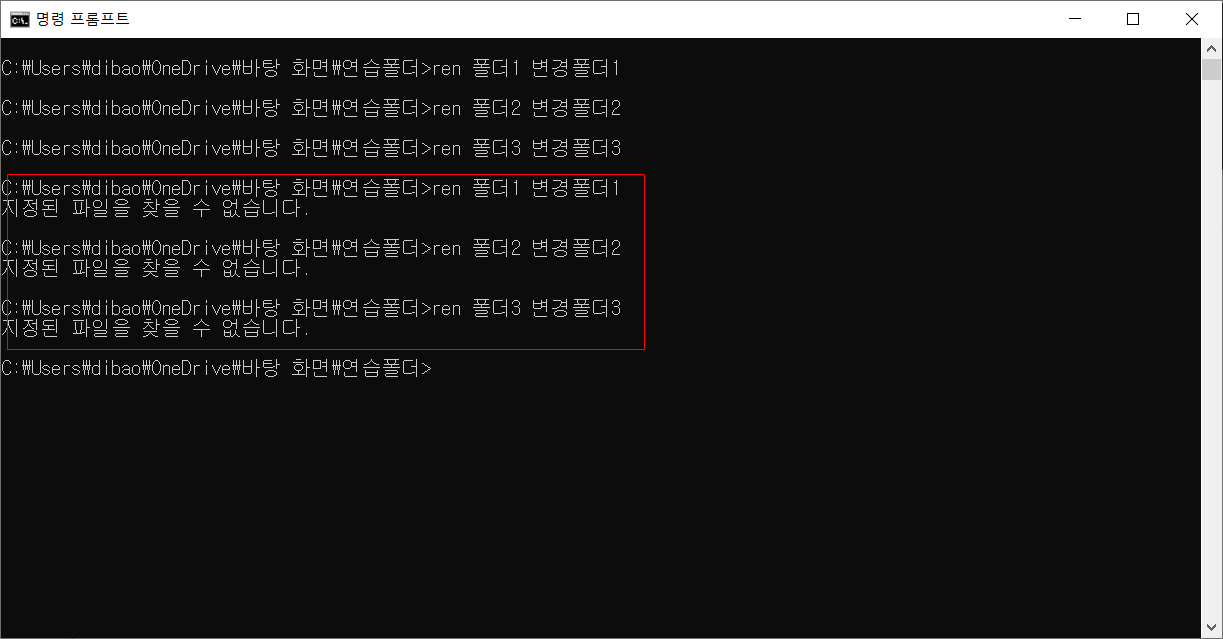 여기서, 폴더명을 변경하는 명령어는 ren (리네임) 이라는 명령어 입니다.