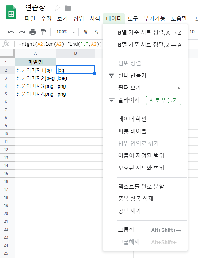 자 그럼 B열에 데이터가 확장자만 나와있죠. 그다음은 함수를사용하는방법도있지만 간단하게 상단 메뉴에서 데이터 - 중복 항목 삭제