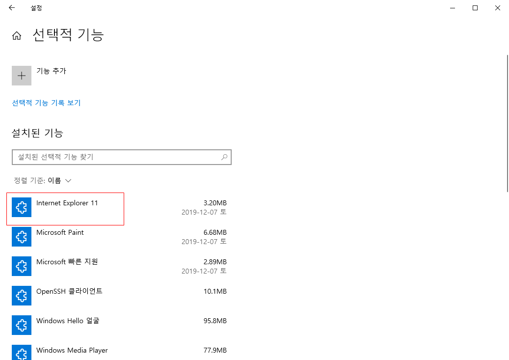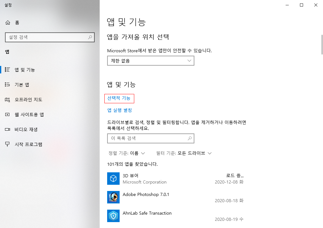 앱 및 기능 내 선택적 기능 버튼을 눌러 선택항목들을 확인한다