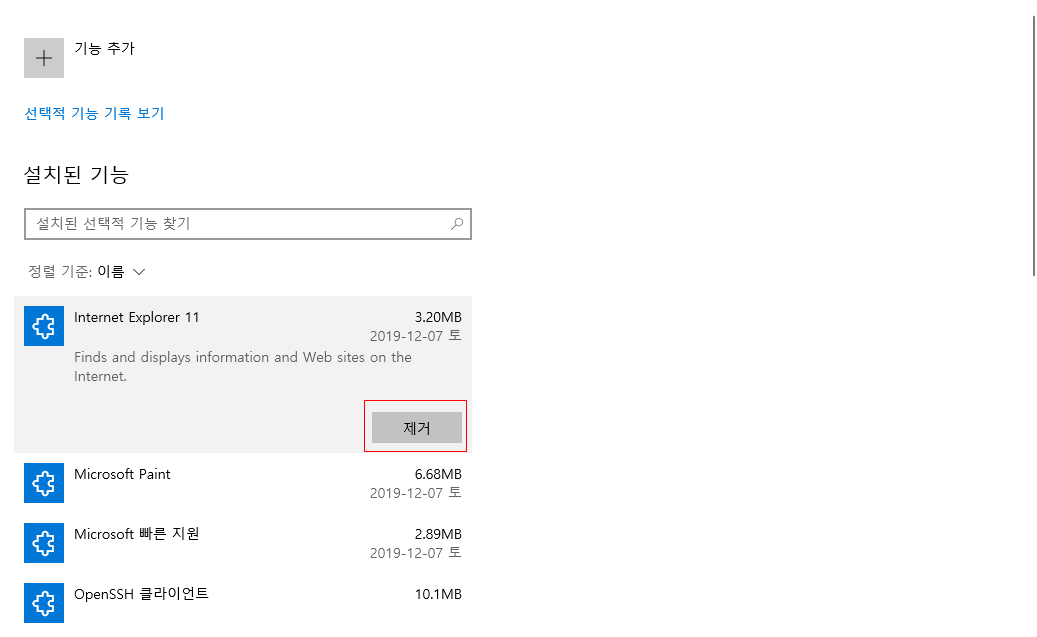 인터넷 익스플로러 11 을 선택한뒤, 제거 버튼을 누른다.