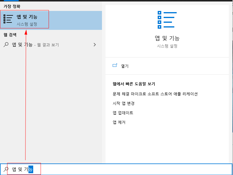윈도우키를 눌러 앱 및 기능 을 검색하여 선택한다.