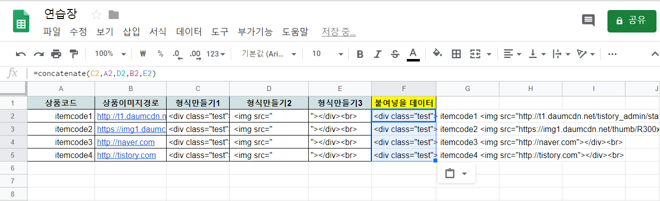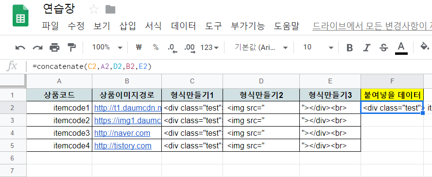 *저는 구글스프레드시트에서 해당형식을 만들어놓고 바로 복사하여 html 을 만든뒤 바로실행시킬수있도록 스프레드시트를 셋팅해두었습니다.