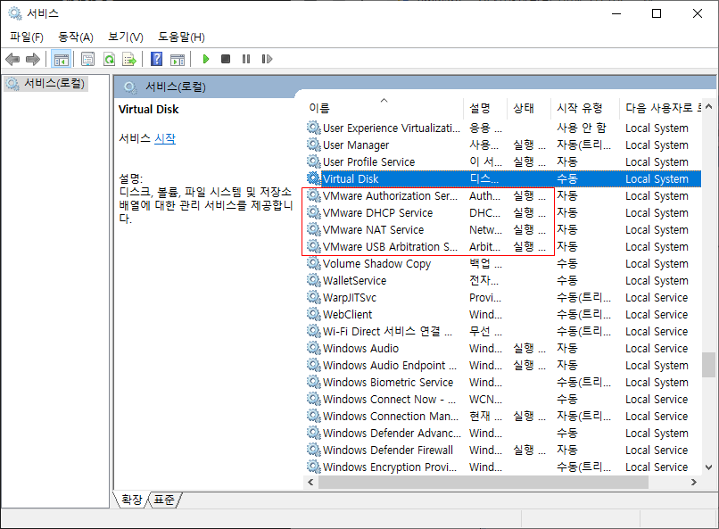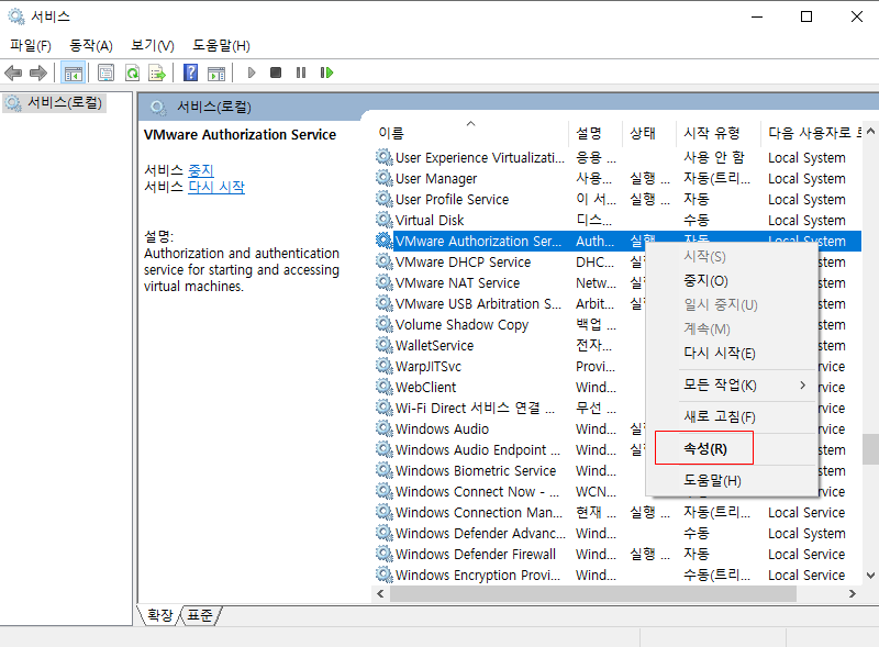 vmware의 관련 서비스를 찾기위해 서비스 목록에서 vmware로 시작하는 서비스를 찾도록한다.