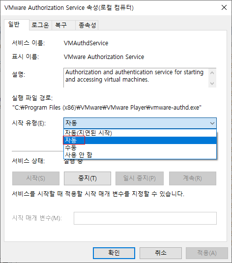 속성에서 시작유형을 "자동"으로 변경한 뒤, 확인버튼을 눌러 변경하도록한다.