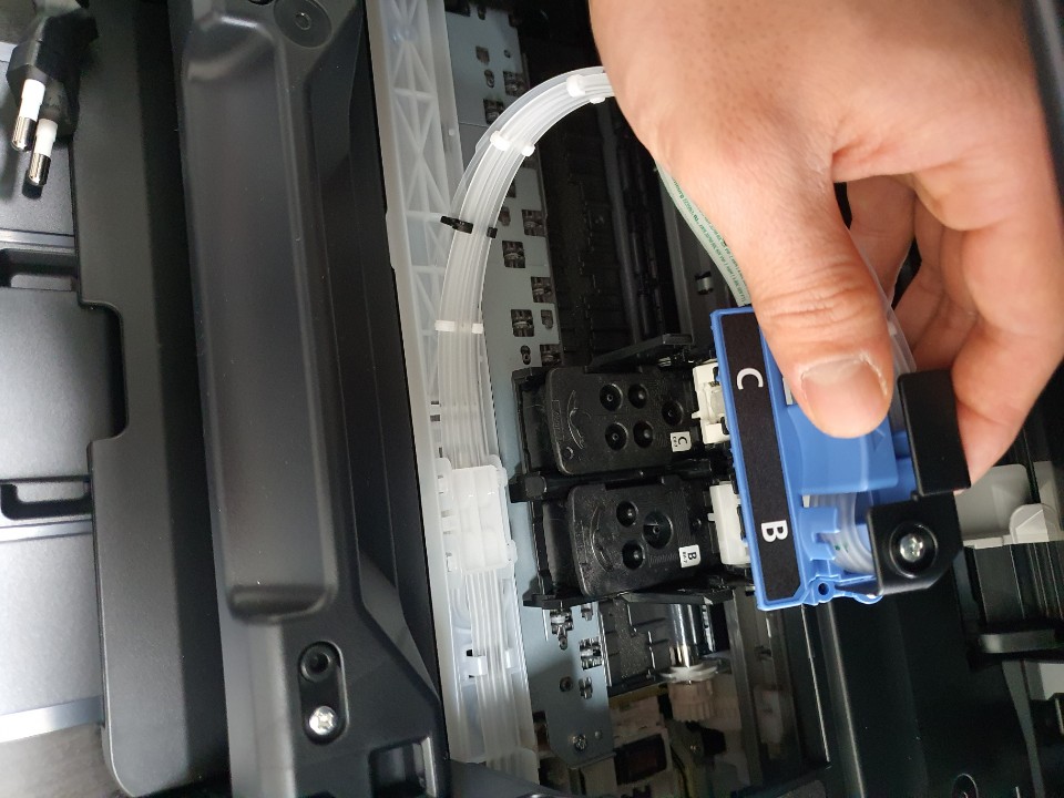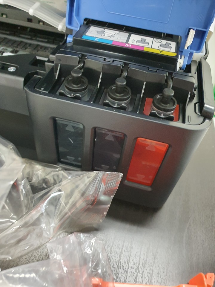 나머지 컬러도 색상에 맞게 잘 주입하도록 한다, 주의점으로는 꼭 맞는색상의 칸에 반드시 넣어야한다. 그렇지 않게되면 구매하자마자 사용하지못하는 복합기가 되어버리게 된다...