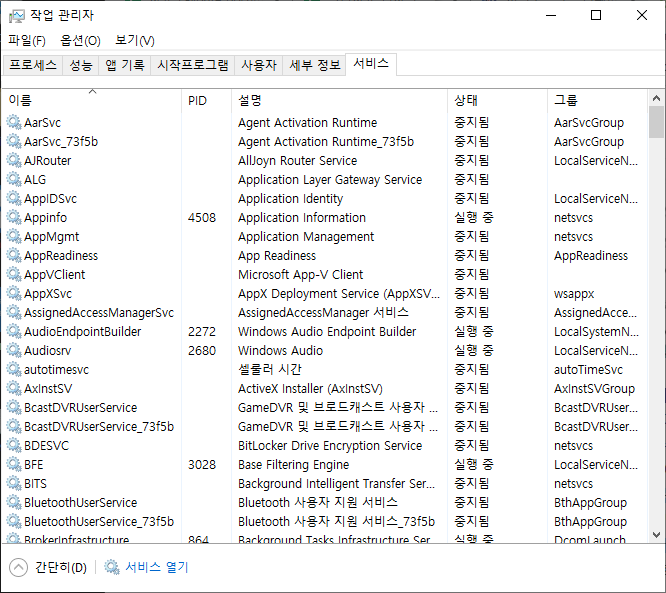 위에 보이는 항목은 내 데스크톱에서 설치된 서비스목록들이다. 상태항목에 실행 중, 으로 확인되는 서비스들은 현재 백그라운드에서 사용자에게 보이지는 않지만 전부 구동되어있는 "녀석" 들 이다, 물론 이중에서는 꼭 필수로 구동되어야하는 것들도 있고 불 필요 한것들이 있지만 이렇게나 많은 서비스를 하나하나 찾아서 지우는것은 굉장히 힘든 작업이므로 우선은 현재 사용하지않는 프로그램들은 전부 지워주도록 하자. 그리고 "실행중" 인 서비스 들 중에 더이상 사용하지않는 항목을 알고 있다면, 과감하게 중지시키도록하자. 이는 모두 데스크톱을 느리게하는 요인중 하나이다.