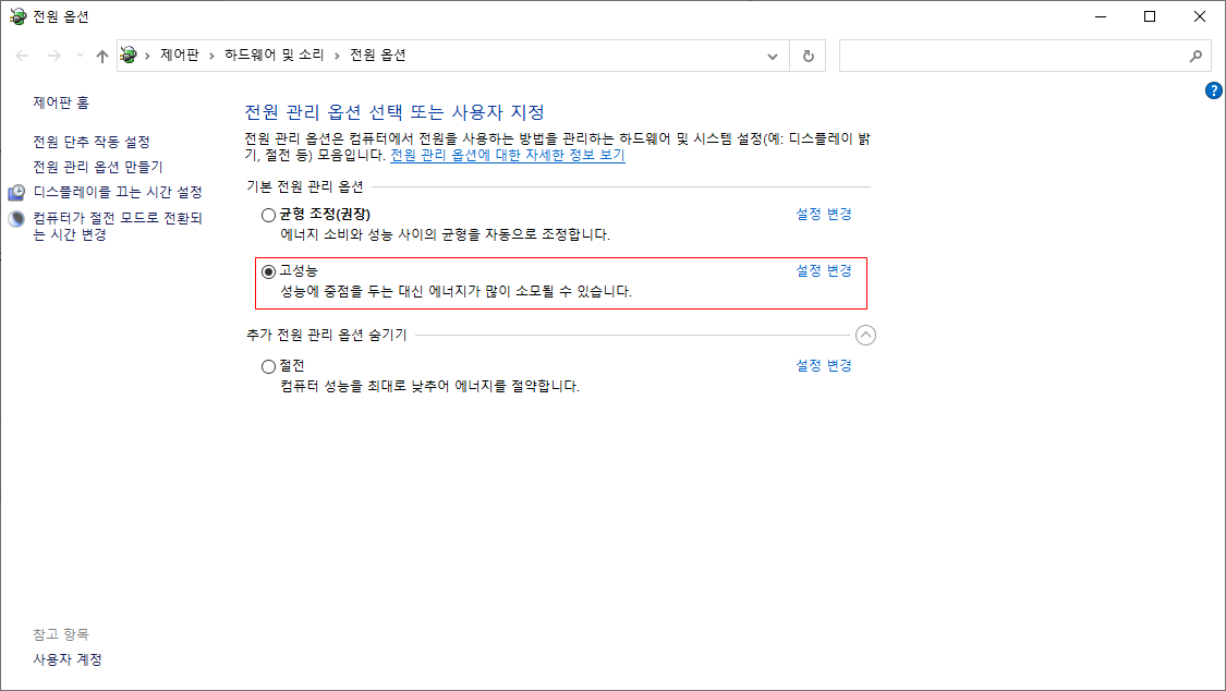 "고성능" 으로 변경하여 성능위주의 설정으로 변경하도록 한다.
