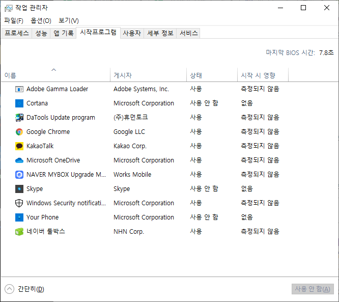 시작프로그램은 사용자에게 아주 유용한 기능이다 데스크톱을 켜자마자 자동으로 프로그램이 실행되어 사용자가 부팅시 매번 실행시킬 필요 없이 자동으로 실행시켜주니 말이다. 하지만 이 시작프로그램의 목록들이 많아지게되면 자동으로 전부를 부팅시켜야하는 데스크톱 입장에서는 부팅후 속도가 느려지는것은 당연한 일이다.