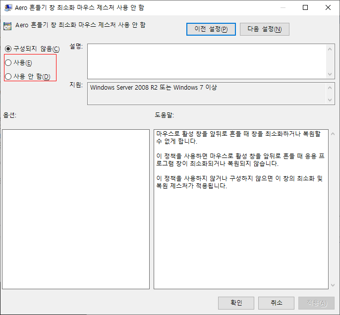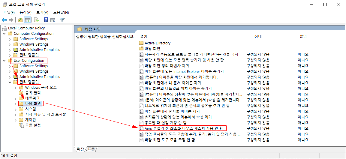 다음, 로컬 그룹 정책 편집기에서 사용자 환경설정 -> 관리 템플릿 -> 바탕화면 -> Aero 흔들기 창 최소화 기능 설정부분을 찾아, 더블클릭하여 설정을 진행하도록 한다.