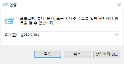 키보드의 윈도우버튼과 R 키를 눌러 실행창을 띄우고 gpedit.msc 를 입력하도록 한다.
