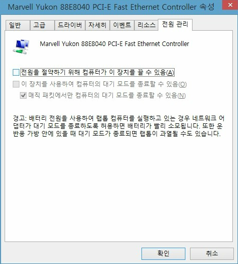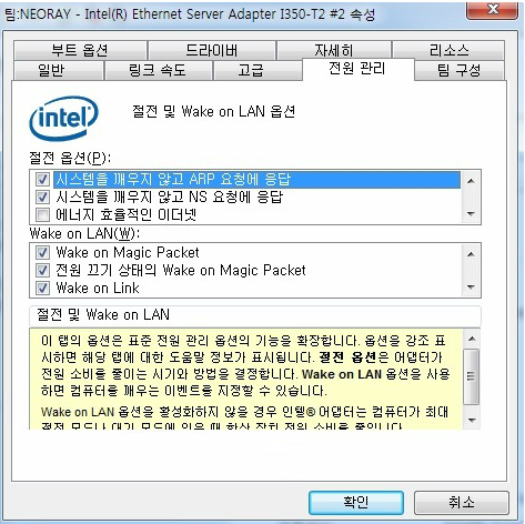 문구는, 랜카드마다 제각기 다 다르고 설정하는 위치도 재각기 다르지만 Wake On 이라는 문구가 들어가 있다면 활성화 하도록 하고 전원 관리에서 "전원을 절약 전원을 절약하기 위해 컴퓨터가 이 장치를 끌 수 있음" 체크를 해제 하면 되겠다.
