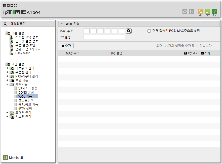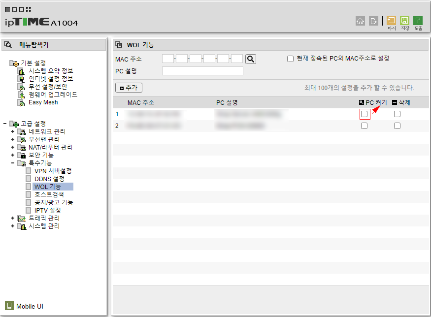관리자로 접속하여 WOL 설정을 할 데스크톱의 PC Mac Adress를 입력하면 되겠다.