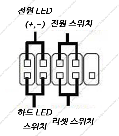 F 패널 또는 jfp 연결순서는 위의 이미지와 같고 메인보드마다 위치가 다르므로 잘 살펴 봐야 한다.