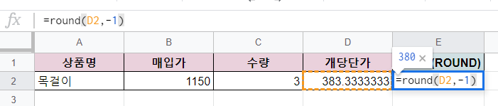 위와같이 380으로 반올림처리되었습니다.