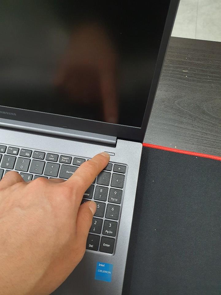 노트북 전원은 위의 버튼을 눌러 실행 시키는데, 처음 받은상태로 눌렀더니 배터리가 없는지 구동되지않아 충전기를 꽂아 충전후 사용하였다