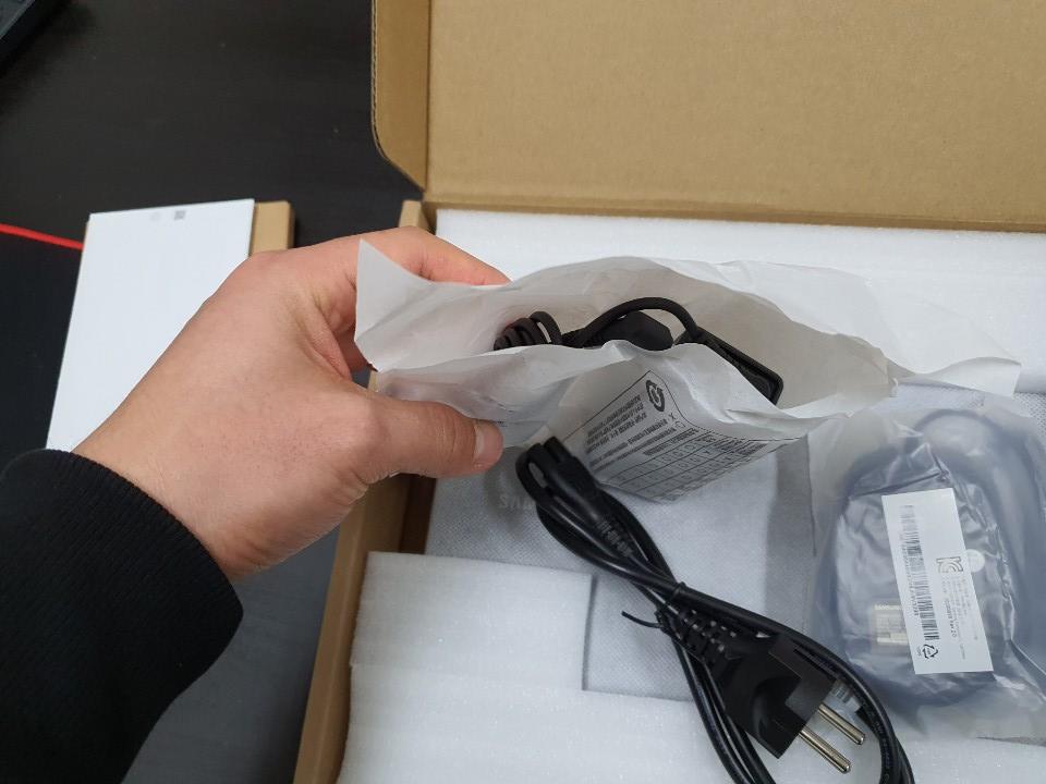 흰 스티로폼에는 노트북이 담겨 있고, 우측에는 노트북 충전기가 포장되어있다