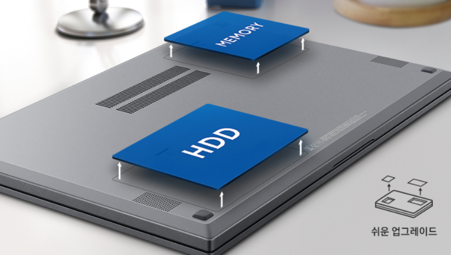 업그레이드가 편하게 전문가가 아니더라도 손쉽게 뒷면을 뜯어 업그레이드 할 수 있도록 제작 되었다 이 부분은 아주 좋은것 같다 하지만 기본으로 M.2가 장착되어있어, 간단한 사무용에 사용할 예정으로 큰 무거운작업을 할 것은 아니므로 추후에 메모리 정도는 고려해봐야겠다.