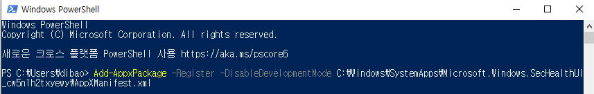 위와같이 붙여넣고 엔터키를 누르면 해당 패키지가 설치되고, 윈도우 디펜더는 정상적으로 열리게 된다.