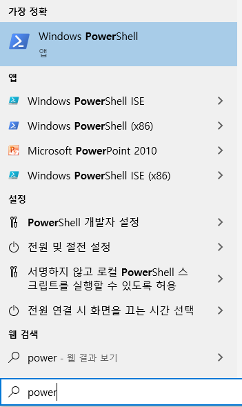 윈도우즈 파워 쉘이라고 하여 마이크로소프트 사 에서 개발한 명령어 프롬프트이다, 이 프롬프트를 실행하기위해 윈도우키를 눌러 Power 라고 검색하여 "Windows PowerShell" 을 실행 한다.