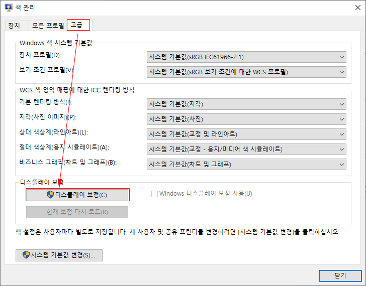 "고급" 탭으로 이동하여 "디스플레이 보정" 버튼을 선택 한다.