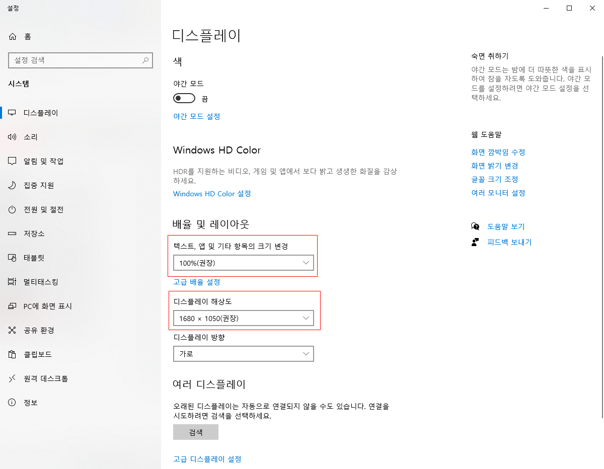 위의 배율 및 해상도를 하나씩 조정해봄으로써 자신에게 맞는 해상도와 배율을 찾아 설정하도록 한다.