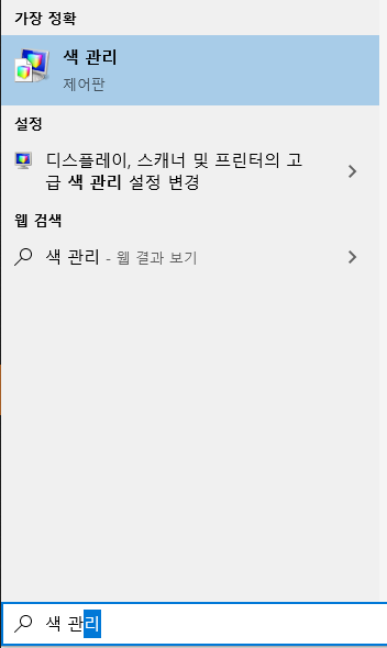 윈도우 키를 눌러 "색 관리" 라고 입력하여 색 관리 관리 화면을 띄우도록 한다.