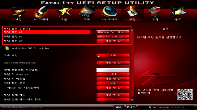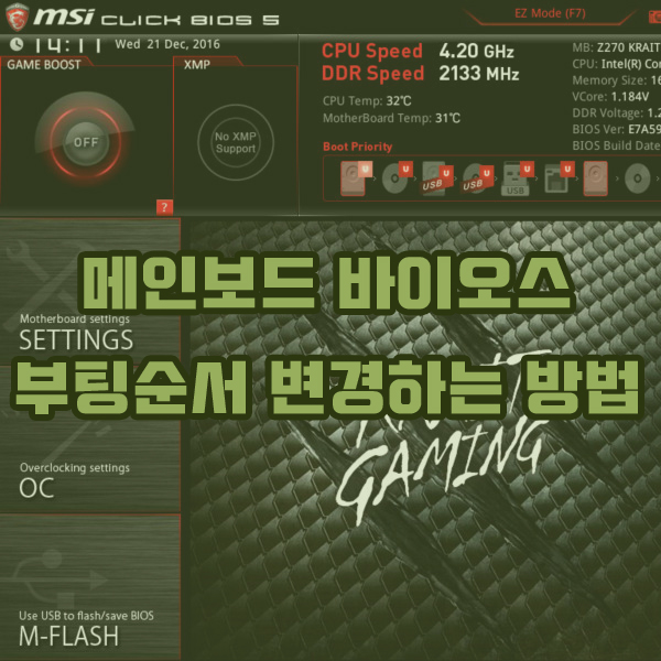 메인보드의 부팅순서를 변경하려면 바이오스(BIOS) 화면으로 진입하여야 한다