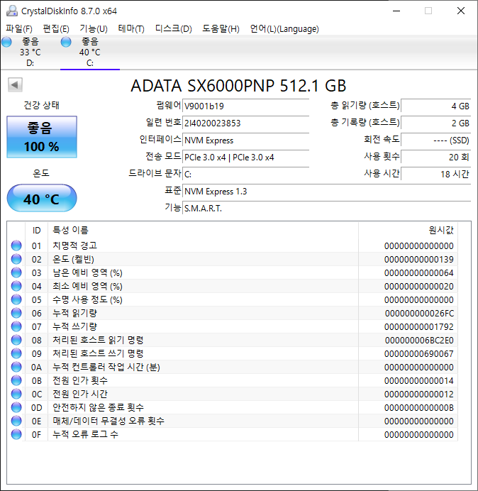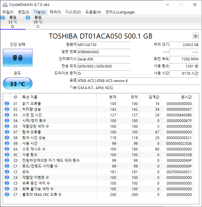 좌측 상단부에는 하드의 현재 온도와, 상태에대해서 기록되어 있으며 중앙부분에는 모델 및 사용횟수와 사용시간 연결 방식에 대해서 기록되어있고, 하단부분에는 각 특성별로 원시값을 확인할 수 있다, 위의 화면은 필자는 C드라이브에 Nvme를, D드라이브는 하드를 이용하여 시스템이 구성되어 있는데 위의 화면은 Nvme 화면이고 하드는 아래와같이 확인된다.