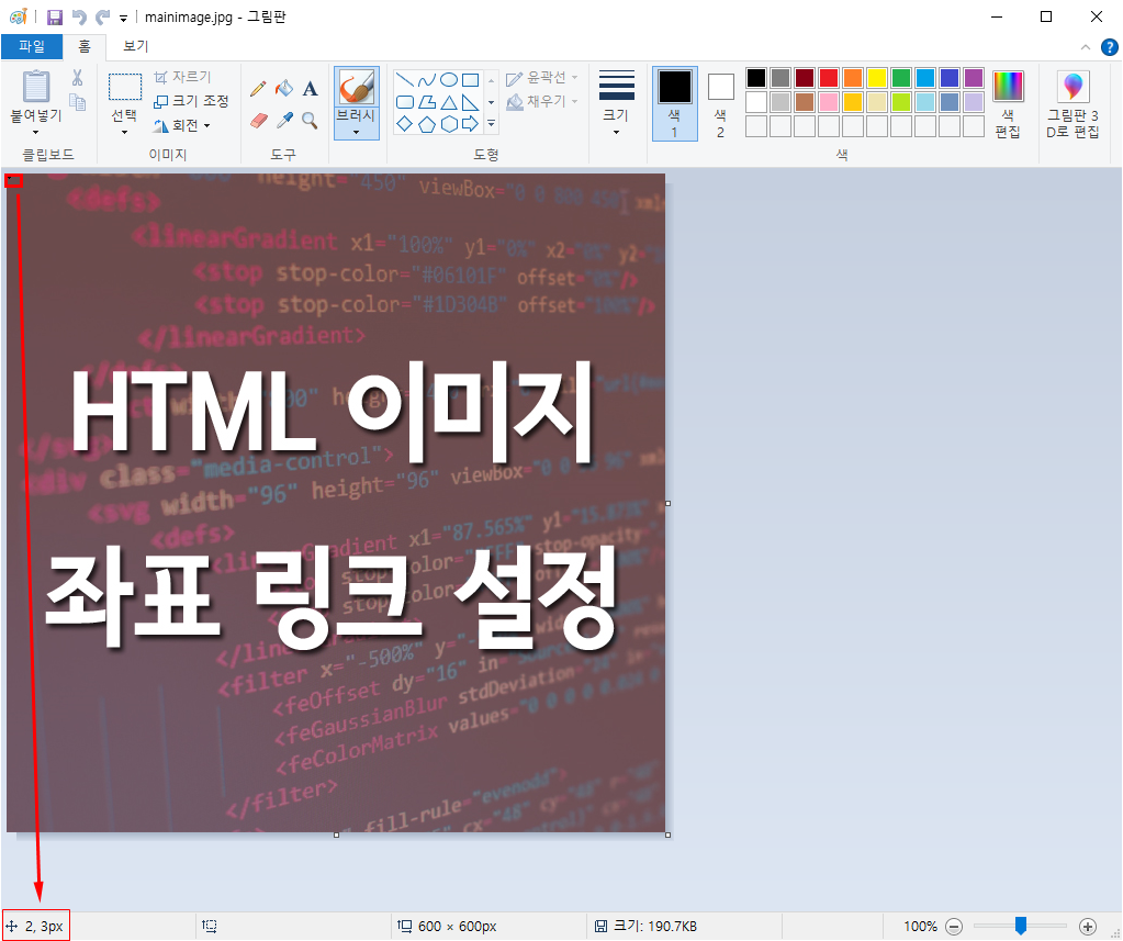 대단한 툴이 아니더라도 윈도우에 탑재되어있는 그림판을 통해 손쉽게 좌표값을 얻을 수 있다, 우선 그림판을 실행하여 좌표를 구할 이미지를 띄우도록 하자.