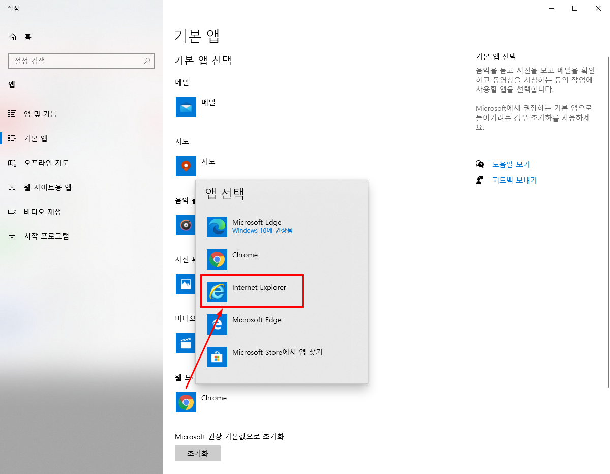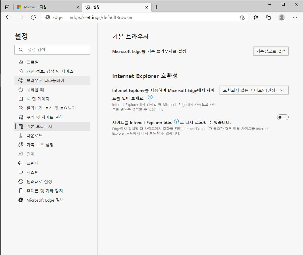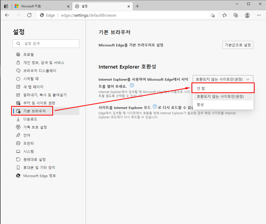 인터넷 익스플로어 실행시 마이크로소프트 엣지 자동 전환