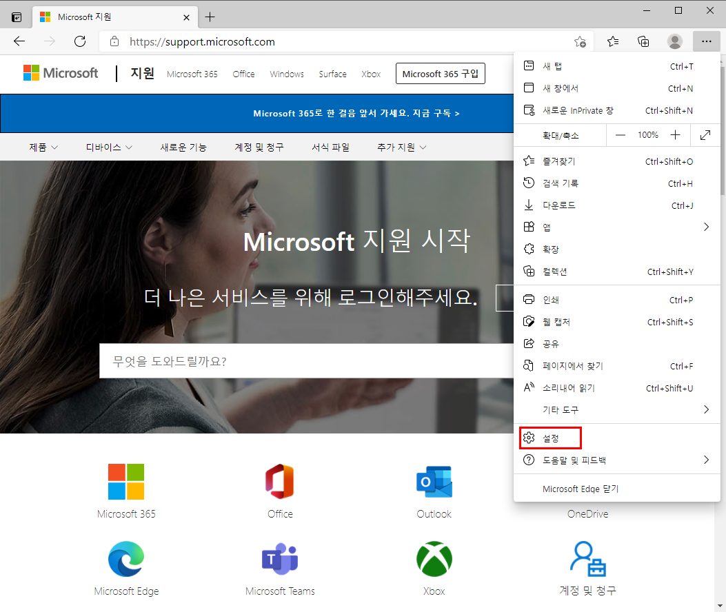 우측 상단부 설정 및 기타 버튼을 눌러 "설정" 항목을 클릭한다.