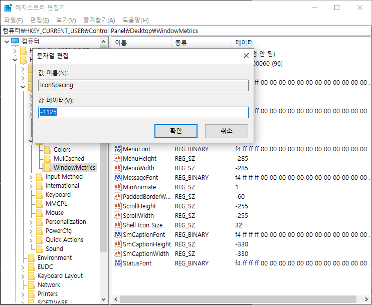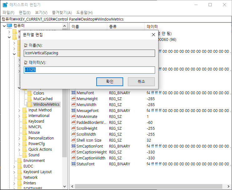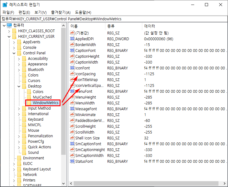 컴퓨터\HKEY_CURRENT_USER\Control Panel\Desktop\WindowMetrics