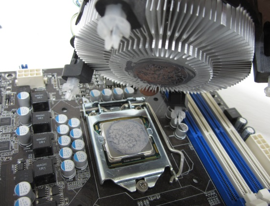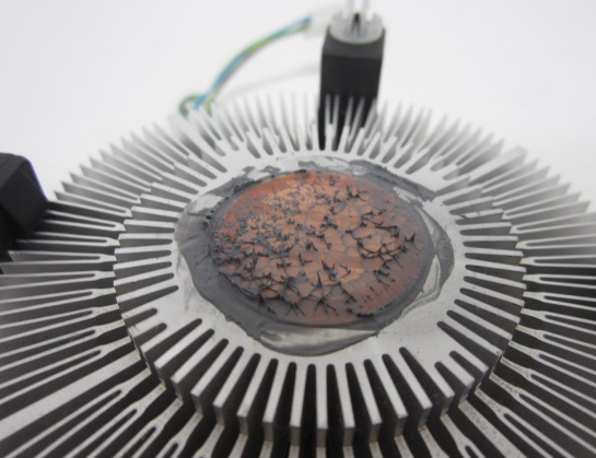 해체하면 CPU부분과, CPU쿨러의 맞닿는 부분이 서멀구리스로 도포되어 오래된 경우 궂어있거나 오래되지 않은 경우라면 아직 액체형태로 남아있을 것이다.
